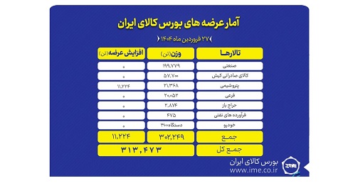 تالارهای بورس کالای ایران امروز ۲۷ فروردین ماه میزبان عرضه ۳۱۳ هزار و ۴۷۲ تن انواع کالا و محصول است.