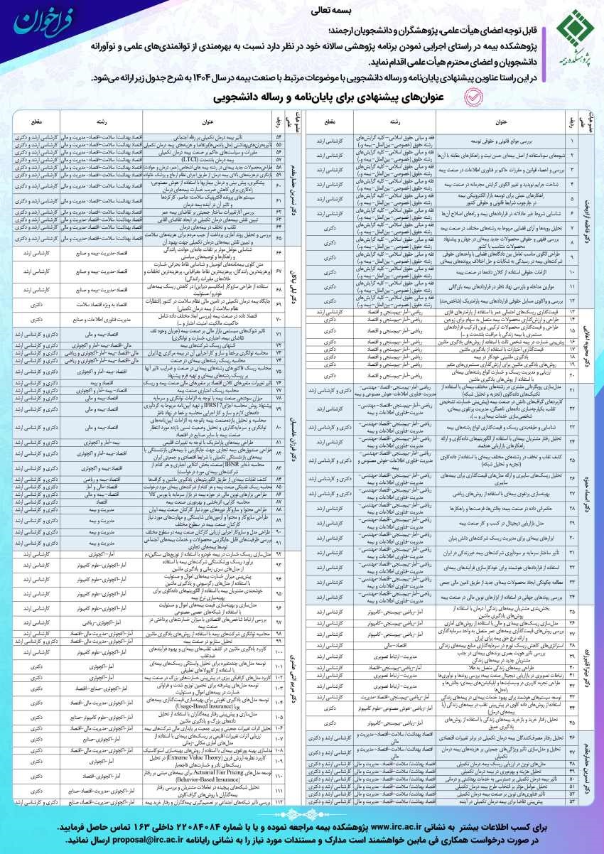 علاقهمندان جهت دریافت عناوین پایاننامههای کارشناسی ارشد و رسالههای دکتری پیشنهادی پژوهشکده بیمه برای سال ۱۴۰۴ میتوانند به پیوست مراجعه نمایند.