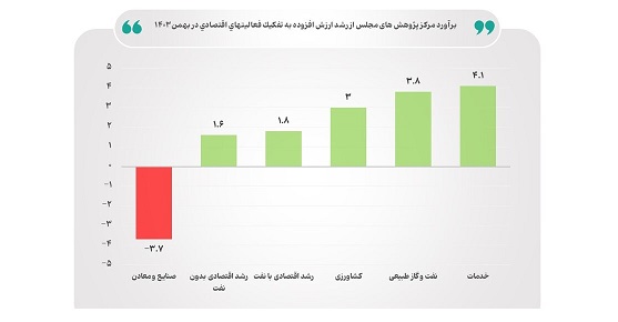 نتایج برآوردهای مرکز پژوهش های مجلس نشان می دهد: ارزش افزوده گروه نفت در بهمن سال ١۴٠٣ نسبت به ماه مشابه سال قبل رشد ۳/۸ درصدی داشته است.