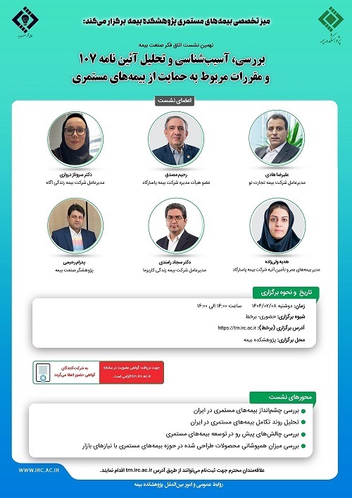 نهمین نشست اتاق فکر صنعت بیمه با عنوان «بررسی، آسیب شناسی و تحلیل آییننامه ۱۰۷ و مقررات مربوط به حمایت از بیمه های مستمری» از ساعت ۱۴ تا ۱۶ روز دوشنبه ۸ اردیبهشت ۱۴۰۴ به صورت برخط از طریق سامانه مدیریت یادگیری پژوهشکده بیمه برگزار میشود.