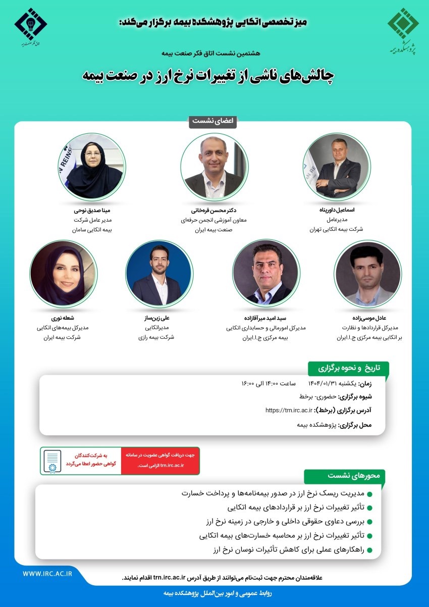 به گزارش فراسو به نقل از روابط عمومی و امور بینالملل پژوهشکده بیمه، در این نشست، دکتر محسن قرهخانی، عضو هیأت علمی مؤسسه آموزش عالی ایرانیان، مینا صدیق نوحی، مدیر عامل شرکت بیمه اتکایی سامان ، اسماعیل داورپناه، مدیرعامل شرکت بیمه اتکایی تهران رواک ، سید امید میرآقازاده، مدیر کل امور مالی و حسابداری اتکایی بیمه مرکزی ج. ا. ایران ، عادل موسیزاده، مدیر کل قراردادها و نظارت بر اتکایی بیمه مرکزی ج. ا. ایران، شعله نوری، مدیر کل بیمههای اتکایی شرکت بیمه ایران و علی زینساز، مدیر اتکایی شرکت بیمه رازی به بحت و بررسی در خصوص «راهکارهای عملی برای کاهش تاثیرات نوسان نرخ ارز (currency clause)»، «مدیریت ریسک نرخ ارز در صدور بیمهنامهها و پرداخت خسارت»، «تاثیر تغییرات نرخ ارز بر قراردادهای بیمه اتکایی»، «بررسی دعاوی حقوقی داخلی و خارجی در زمینه نرخ ارز» و «تاثیر تغییرات نرخ ارز بر محاسبه خسارتهای بیمه اتکایی» خواهند پرداخت.