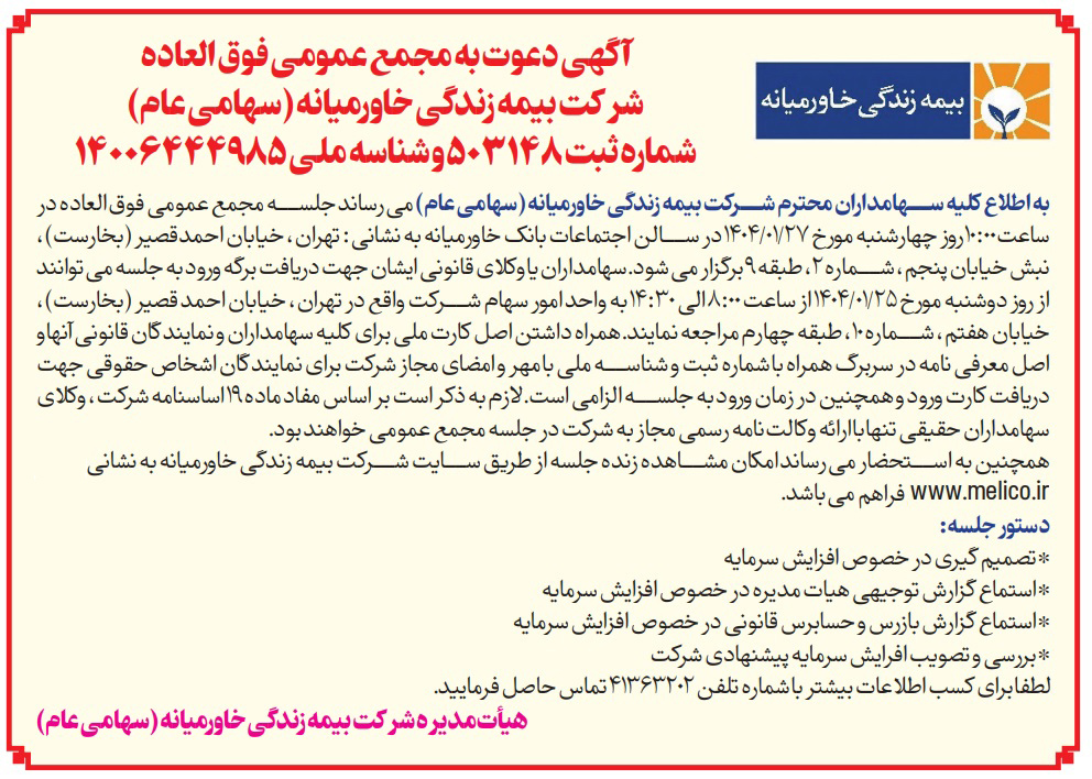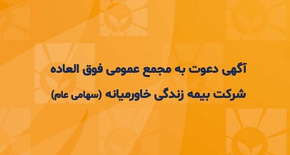 هیأتمدیره شرکت بیمه زندگی خاورمیانه سهامداران این شرکت را به حضور در مجمع عمومی فوق العاده در روز چهارشنبه ۲۷ فروردین ماه جاری دعوت کرد. به گزارش فراسو، متن کامل دعوت نامه منتشر شده بدین شرح است: