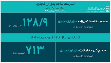بانک مرکزی از ابتدای سال جاری تا ۱۷ فروردین ماه ۹۵۹ میلیون دلار ارز موردنیاز برای واردات را تامین کرده است. همچنین حجم معاملات روزانه بازار ارز تجاری در روز سه شنبه ۱۹ فروردین ماه ۱۴۰۴ معادل ۱۲۸٫۹ میلیون دلار و حجم کل معاملات در بازار ارز تجاری از ابتدای سال جاری تا ۱۹ فروردین ۷۱۳ میلیون دلار بوده است.