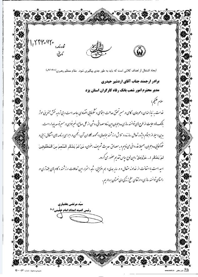 حمایتهای بانک رفاه کارگران استان یزد از اجرای برنامههای اشتغالزایی و خودکفایی مددجویان، مورد قدردانی رئیس کمیته امداد امام خمینی(ره) قرار گرفت.