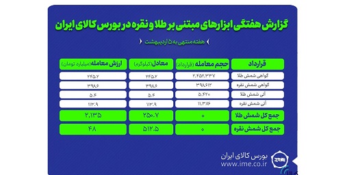 بررسی عملکرد ابزارهای مبتنی بر طلا و نقره در بورس کالای ایران نشان میدهد که در هفته گذشته در مجموع ۵۱۲.۵ کیلوگرم شمش نقره و ۲۵۰.۷ کیلوگرم شمش طلا در بازار گواهی سپرده و آتی معامله شد.