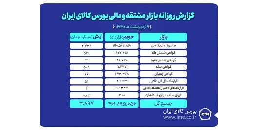 روز گذشته در بازار مشتقه و مالی بورس کالای ایران در مجموع ۴۶۱ میلیون و ۸۹۵ هزار و ۶۵۶ قرارداد به ارزش ۳ هزار و ۸۹۷ میلیارد تومان منعقد شد.