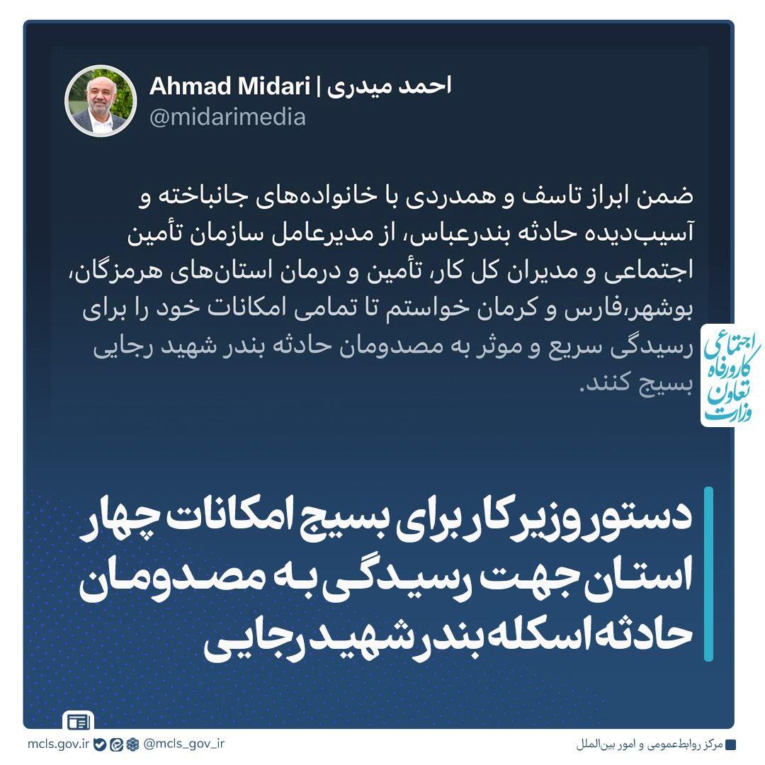 وزیر تعاون، کار و رفاه اجتماعی امکانات استان های هرمزگان، بوشهر، فارس و کرمان را برای رسیدگی فوری و موثر به مصدومان حادثه بندر شهید رجایی بسیج کرد.