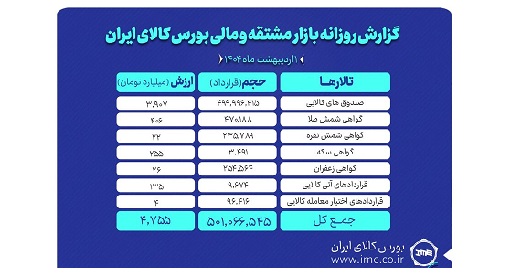 روز گذشته در بازار مشتقه و مالی بورس کالای ایران در مجموع بیش از ۵۰۱ میلیون و ۶۶ هزار قرارداد به ارزش ۴ هزار و ۷۵۵میلیارد تومان منعقد شد.