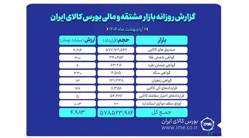 روز گذشته در بازار مشتقه و مالی بورس کالای ایران در مجموع بیش از ۵۷۸ میلیون و ۵۲۳ هزار و ۹۸۲ قرارداد به ارزش ۴ هزار و ۹۸۳ میلیارد تومان منعقد شد.
