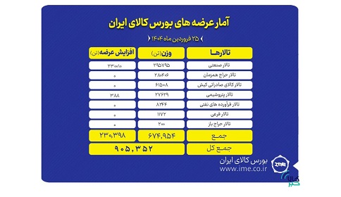 به این ترتیب تالارهای بورس کالای ایران روز دوشنبه شاهد عرضه ۹۰۵ هزار و ۳۵۲ تن انواع کالا و محصول است./کالاخبر