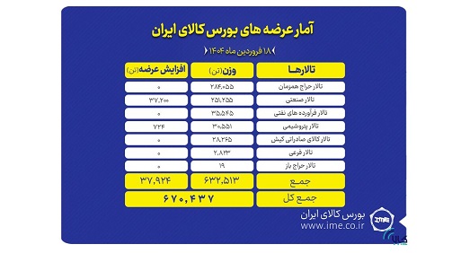 تالارهای بورس کالای ایران روز دوشنبه ۱۸ فروردین ماه میزبان عرضه ۶۷۰ هزار و ۴۳۷ تن انواع کالا و محصول است.