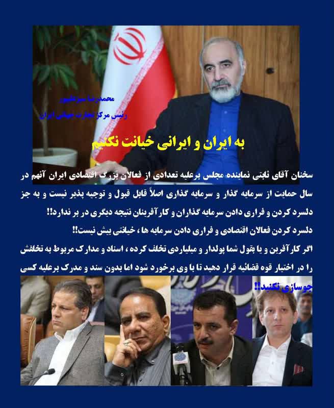 سخنان آقای ثابتی نماینده مجلس برعلیه تعدادی از فعالان بزرگ اقتصادی ایران آنهم در سال حمایت از سرمایه گذار و سرمایه گذاری اصلاً قابل قبول و توجیه پذیر نیست و به جز دلسرد کردن و فراری دادن سرمایه گذاران و کارآفرینان نتیجه دیگری در بر ندارد!!