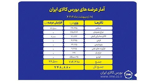 تالارهای بورس کالای ایران امروز دوشنبه ۸ اردیبهشت ماه میزبان عرضه ۷۴۸ هزار و ۸۸۰ تن انواع کالا و محصول است.