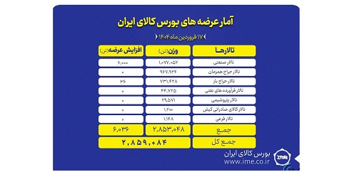 تالارهای بورس کالای ایران در نخستین روز هفته (یکشنبه ۱۷ فروردین ماه) میزبان عرضه ۲ میلیون و ۸۵۹ هزار و ۸۴ تن انواع کالا و محصول است.