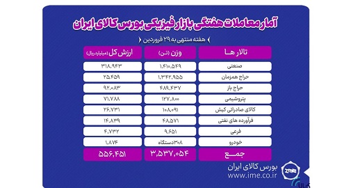 در معاملات هفته گذشته بازار فیزیکی بورس کالای ایران ۳ میلیون و ۵۳۷ هزار و ۵۳ تن انواع محصول به ارزش ۵۵ هزار میلیارد تومان دادوستد شد که نسبت به هفته ما قبل به ترتیب رشدیک و ۳ درصدی را در حجم و ارزش معاملات تجربه کرد.