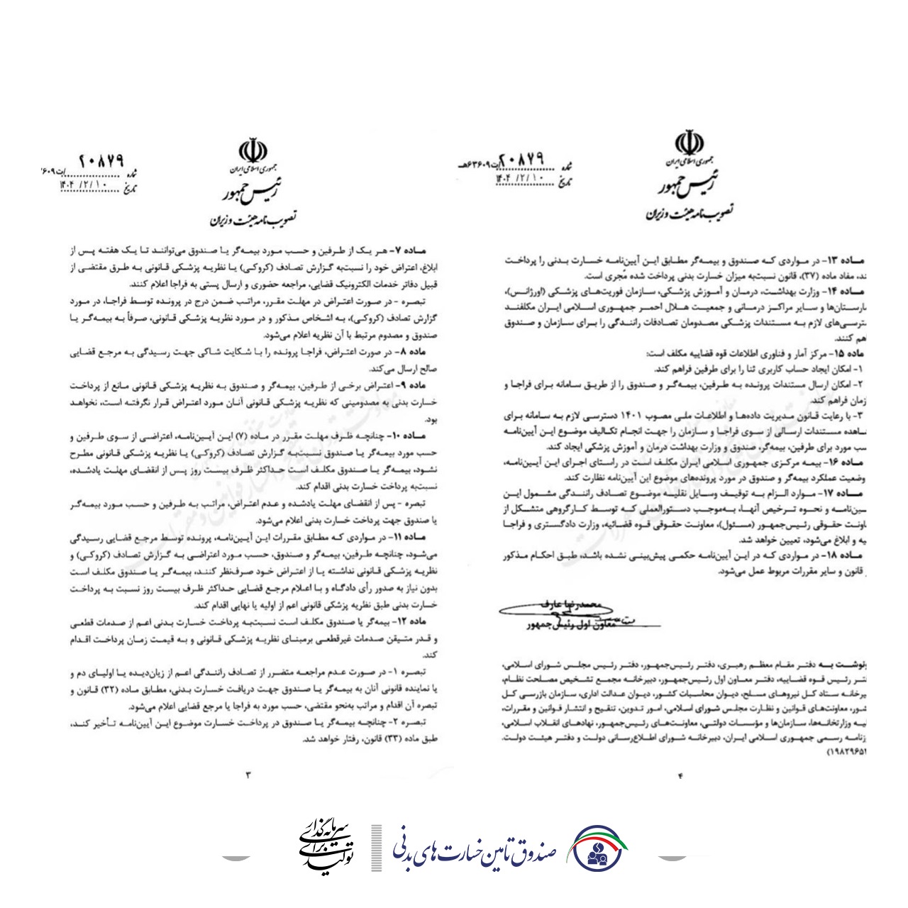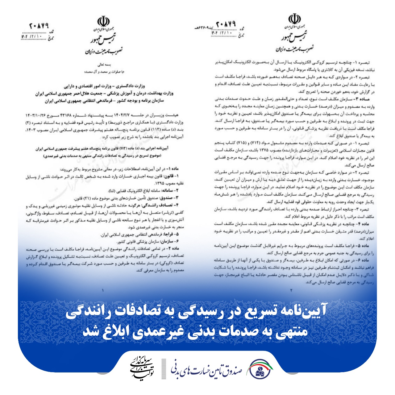 به نحوی که در صورت عدم اعتراض طرفین حادثه و نیز نهاد مسئول جبران خسارت به گزارش تصادف (کروکی) یا نظریات پزشکی قانونی، خسارتهای جانی واردشده به زیاندیده که قابلیت محاسبه داشته باشد، حداکثر ظرف ۲۰ روز بدون نیاز به رأی مرجع قضائی، پرداخت میشود.