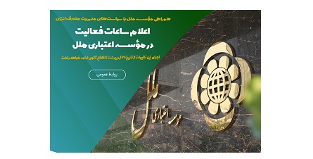 به گزارش فراسو به نقل از روابط عمومی مؤسسه اعتباری ملل، براساس این ابلاغیه، ساعت کاری شعب و خدمت رسانی به مشتریان موسسه در روزهای شنبه تا چهارشنبه از ساعت ۷:۰۰ تا ۱۳:۰۰ و در روز پنجشنبه از ساعت ۷:۰۰ تا ۱۲:۰۰ صورت میپذیرد.