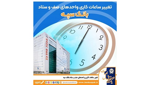به گزارش فراسو به نقل از پایگاه اطلاع رسانی بانک سپه، بر اساس مصوبه هیات محترم وزیران ساعت کاری کلیه واحدهای بانک سپه از روز شنبه ۲۰ اردیبهشت ماه سالجاری از ساعت ۶ الی ۱۳ تعیین شد.