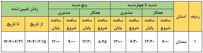 بنا بر ابلاغ استانداری تعدادی از استانهای کشور و کمیسیون هماهنگی بانکها مبنی بر تغییر ساعت کاری بانکها با هدف صرفهجویی و مدیریت مصرف حاملهای انرژی، ساعت کاری شعب استان سمنان بانک اینده طی بازهزمانی اردیبهشت تا شهریورماه ۱۴۰۴به شرح جدول زیر، تغییر کرد.