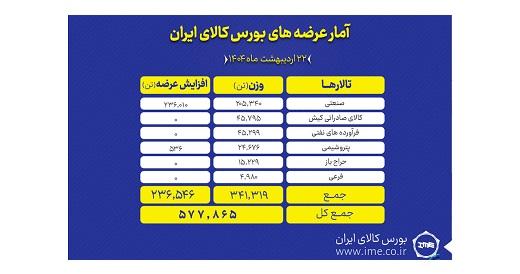 تالارهای بورس کالای ایران امروز دوشنبه ۲۲ اردیبهشت ماه میزبان عرضه ۵۷۷ هزار و ۸۶۴ تن انواع محصول است.
