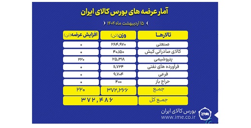 تالارهای بورس کالای ایران امروز دوشنبه ۱۵ اردیبهشت ماه میزبان عرضه ۳۷۲ هزار و ۴۸۶ تن انواع محصول است.
