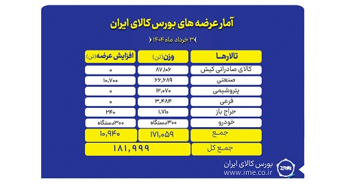 تالارهای بورس کالای ایران امروز شنبه ۳ خرداد ماه میزبان عرضه ۱۸۱ هزار و ۹۹۹ تن انواع محصول است.