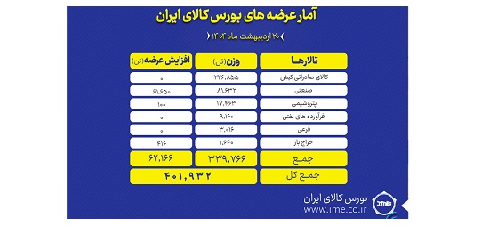 تالارهای بورس کالای ایران امروز شنبه ۲۰ اردیبهشت ماه میزبان عرضه ۴۰۱ هزار و ۹۳۱ تن انواع محصول است.