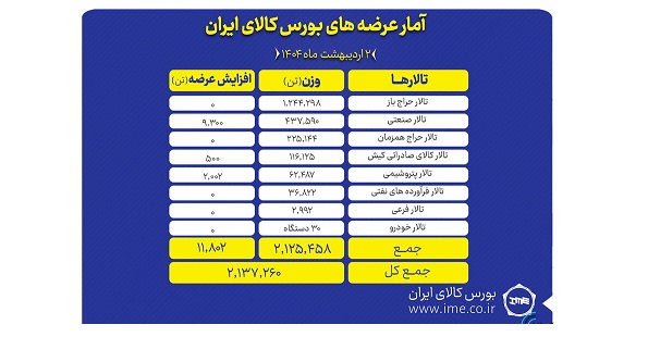 تالارهای بورس کالای ایران امروز سهشنبه ۳۰ اردیبهشت ماه میزبان عرضه ۲ میلیون و ۱۳۷ هزار و ۲۶۰ تن انواع محصول است.