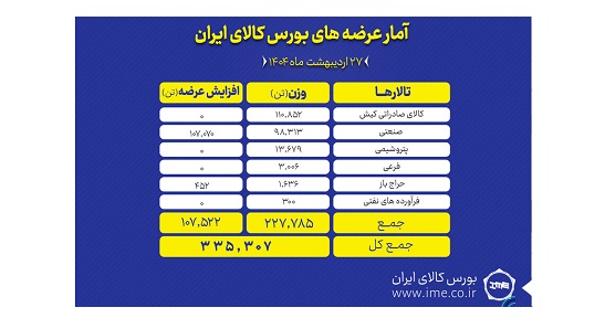 تالارهای بورس کالای ایران امروز شنبه ۲۷ اردیبهشت ماه میزبان عرضه ۳۳۵ هزار و ۳۰۷ تن انواع محصول است.