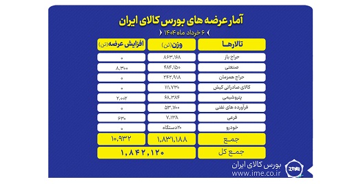 تالارهای بورس کالای ایران امروز سه شنبه ۶ خرداد ماه میزبان عرضه یک میلیون و ۸۴۲ هزار و ۱۲۰ تن انواع محصول است.