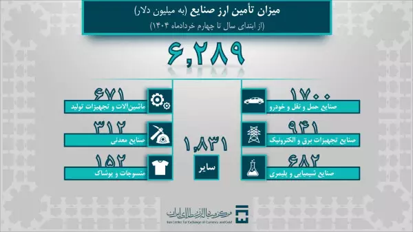 به گزارش فراسو به نقل از مدیریت ارتباطات مرکز مبادله ایران، ۶ میلیارد و ۲۸۹ میلیون دلار از ارز تامین شده به گروه تجاری و بازرگانی تخصیص داده شده است؛ صنایع «حمل و نقل خودرو» با یک میلیارد و ۷۰۰ میلیون دلار، «صنایع تجهیزات برق و الکترونیک» با ۹۴۱ میلیون دلار، «صنایع شیمایی و پلیمری» با ۶۸۲ میلیون دلار، «ماشین آلات و تجهیزات تولید» با ۶۷۱ میلیون دلار ،«صنایع معدنی» با ۳۱۲ میلیون دلار و «منسوجات و پوشاک» با ۱۵۲ میلیون دلار به ترتیب بیشترین سهم از ارز واردات صنایع را داشته اند. همچنین برای سایر صنایع، یک میلیارد و ۸۳۱ میلیون دلار تامین ارز شده است.