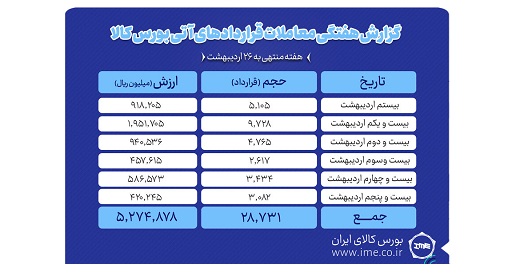 بررسی روند معاملات قراردادهای آتی بورس کالای ایران درهفته منتهی به ۲۵ اردیبهشت ماه نشان می دهد که در هفته گذشته بیش از ۲۸ هزار قراردادآتی منعقد شد و ارزش این معاملات به ۵۲۷ میلیارد تومان رسید.