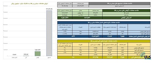 در قراردادهای اختیار معامله مبتنی بر طلا نیز ۹هزار و ۵۵۱ قرارداد به ارزش ۴۰۰ میلیون تومان دادوستد شد.همچنین ۳ هزار و ۱۵۱ قراردادآتی مبتنی بر طلا به ارزش ۴۷ میلیارد تومان معامله شد./کالاخبر