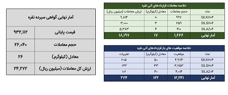 در روز ۱۵ اردیبهشت ماه در مجموع حدود ۴۳ کیلوگرم شمش نقره در بازار گواهی سپرده و قرارداد آتی مورد معامله قرار گرفت.