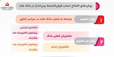 روش های افتتاح حساب قرض الحسنه پس انداز بانک ملت در قالب راهنمای تصویری ارائه شده است.