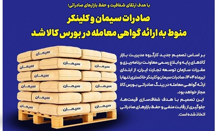 مطابق با بند (۱) صورتجلسه کارگروه مدیریت بازار کالاهای پایه و همچنین بند (۶) تصویبنامه اصلاحی قانون مقررات صادرات و واردات (ابلاغیه شماره ۲۰۷۵۰/ت۶۳۷۷۷هـ مورخ ۱۴۰۴/۰۲/۱۰)، کلیه صادرکنندگان سیمان و کلینکر خاکستری موظفند پیش از انجام عملیات صادرات، گواهی معامله در رینگ صادراتی بورس کالا را ارائه کنند.