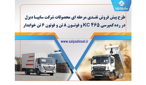 به گزارش فراسو به نقل از سایپانیوز، طرح فروش نقدی مرحله ای محصولات شرکت سایپادیزل که شامل محصولات کامیون کمپرسی KC، کامیونت فوتون ام ۴ ، ۸ تن و کامیونت فوتون ام ۴ ، ۶ تن خوابدار است از ساعت ۹ صبح روز دوشنبه ۱۵ اردیبهشت ماه تا اتمام ظرفیت (تعداد محدود) آغاز خواهد شد.