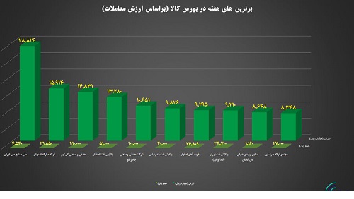 آمار معاملات بازار فیزیکی بورس کالای ایران نشان می دهد در هفته منتهی به ۹ خرداد ماه حدود ۲ میلیون و ۲۷۷ تن انواع کالا و محصول به ارزش بالغ بر ۳۶.۸ هزار میلیارد تومان معامله شد. همچنین ارزش معاملات ۱۰ شرکت برتر به بیش از ۱۲.۹ هزار میلیارد تومان رسید.