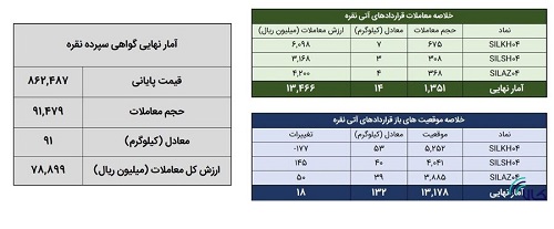 در روز ۴ خرداد ماه در مجموع حدود ۱۰۵ کیلوگرم شمش نقره در بازار گواهی سپرده و قرارداد آتی مورد معامله قرار گرفت.
