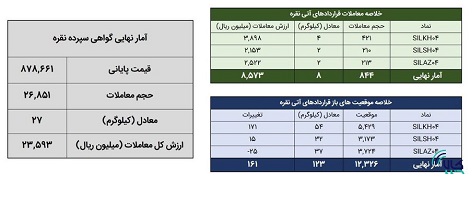 در روز ۲۲ اردیبهشت ماه در مجموع حدود ۳۵ کیلوگرم شمش نقره در بازار گواهی سپرده و قرارداد آتی مورد معامله قرار گرفت.
