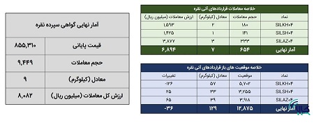 در روز ۲۷ اردیبهشت ماه در مجموع حدود ۱۶ کیلوگرم شمش نقره در بازار گواهی سپرده و قرارداد آتی مورد معامله قرار گرفت.