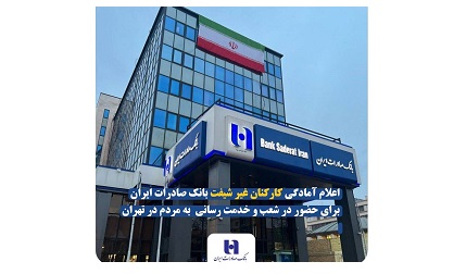 کارکنان شعب غیر شیفت بانک صادرات ایران در مناطق مختلف تهران با روحیه انقلابی و ملی برای حضور در شعب و خدمت رسانی به مشتریان بانک اعلام آمادگی کردند.