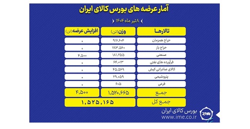 تالارهای بورس کالای ایران امروز یکشنبه ۸ تیر ماه میزبان عرضه یک میلیون و ۵۲۵ هزار و ۱۶۵ تن انواع محصول است. بیشترین عرضه امروز در تالار حراج همزمان رقم می خورد.