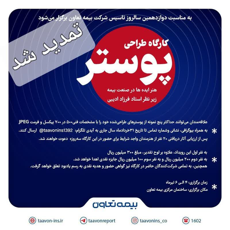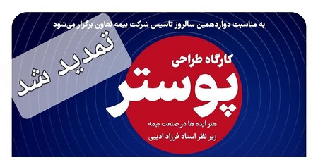 با توجه به شرایط پیشآمده و ضرورت همراهی با فضای عمومی کشور، زمان برگزاری کارگاه تخصصی طراحی پوستر «هنر ایدهها در صنعت بیمه» که به مناسبت دوازدهمین سالروز تأسیس شرکت بیمه تعاون برنامهریزی شده بود، به زمان دیگری موکول میشود. تاریخ جدید برگزاری این رویداد اطلاعرسانی خواهد شد.