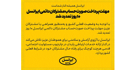 شرکت ایرانسل با صدور اطلاعیه ای اعلام کرد با توجه به وضعیت فعلی کشور و بهمنظور همراهی با مشترکان عزیز، مهلت پرداخت صورتحساب مشترکان دائمی ایرانسل ۱۰ روز تمدید شد.