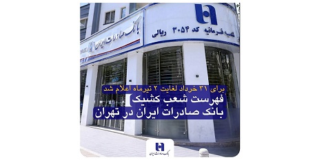 براساس اطلاعیه جدید شورای هماهنگی بانکها در تاریخ ۲۹ خردادماه، مقرر شده است بانک صادرات ایران از روز شنبه هفته آینده ۳۱ خرداد لغایت ۲ تیر با ۵۰ درصد شعب خود در سطح تهران به ارائه خدمات به مردم عزیز بپردازد.