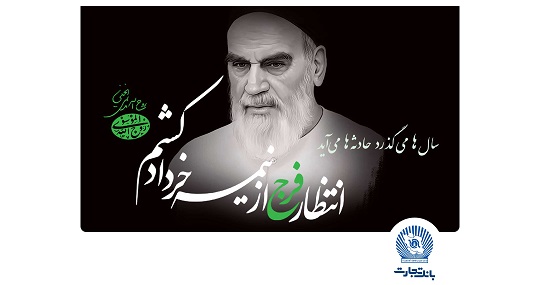 اینجانب به نمایندگی از هیأتمدیره، فرارسیدن سیوششمین سالروز عروج ملکوتی معمار کبیر انقلاب اسلامی، حضرت امام خمینی (ره) و نیز شهادت انقلابیون و یاران ایشان در قیام ۱۵ خرداد را به عموم ملت شریف، مشتریان، سهامداران و کارکنان متعهد و تلاشگر بانک تجارت و شبکه بانکی کشور تسلیت عرض نموده، تداوم عزت و سرافرازی نظام مقدس جمهوری اسلامی ایران، تحت لوای رهبری فرزانه و معظم انقلاب را از درگاه حضرت احدیت مسئلت دارم.