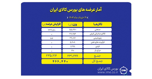 تالارهای بورس کالای ایران روز دوشنبه ۱۹ خرداد ماه میزبان عرضه ۴۶۶ هزار و ۴۴۰ تن انواع محصول است و تالار صنعتی با عرضه بیش از ۳۹۰ هزار تن محصول پیشتاز سایر تالارهاست.