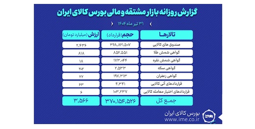 روز گذشته در بازار مشتقه و مالی بورس کالای ایران در مجموع بیش از ۳۷۰ میلیون و ۱۵۴ هزار قرارداد به ارزش ۳ هزار و ۵۶۶ میلیارد تومان منعقد شد.