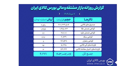 روز گذشته در بازار مشتقه و مالی بورس کالای ایران در مجموع بیش از ۴۰۳ میلیون و ۷ هزار قرارداد به ارزش ۴ هزار و ۲۷۱ میلیارد تومان منعقد شد.